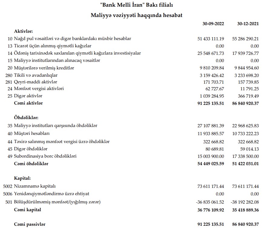 30 Sentyabr 2022-ci il tarixində "Bank Melli İran" Bakı filialı 51 milyon 798 min manat məcmu kapitala malik olub.