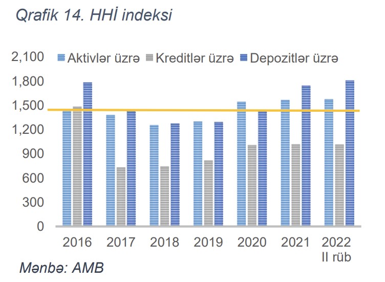 Qeyd edilib ki, təmərküzləşmənin qiymətləndirilməsi üçün beynəlxalq təcrübədə geniş tətbiq olunan Herfindahl-Hirschman İndeksi (HHİ) Azərbaycanın bank sistemində aşağı və orta səviyyəli təmərküzləşməni göstərir (aktivlər üzrə təxminən 1600 bənddə olan indeks orta səviyyədə təmərküzləşmiş bazarları göstərən 1500-2500 bənd civarındadır).