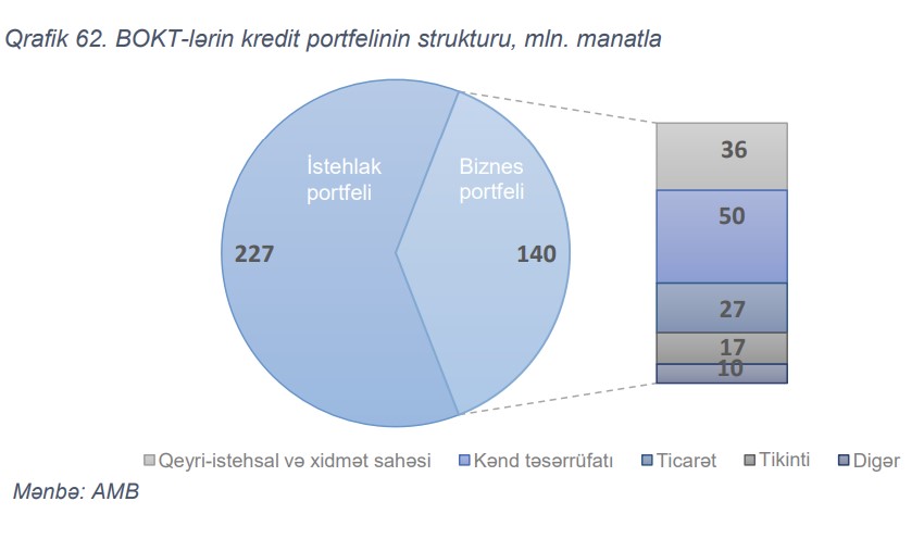 Cari ildə də istehlak kreditləri BOKT-lərin portfelində əsas yeri tutmaqda davam edir. 2022-ci ilin ilk 6 ayının sonuna BOKT-lərin kredit portfelinin 62%-i (227 mln. manat) istehlak kreditləri, 38%-i (140 mln. manat) isə biznes kreditləri təşkil edir. Biznes portfelinin 35.6%-i (50 mln. manat) kənd təsərrüfatı, 26.1%-i (36 mln. manat) qeyriistehsal və xidmət, 19.0%-i (27 mln. manat) isə ticarət sahələrinə verilmiş kreditlər təşkil edir.
