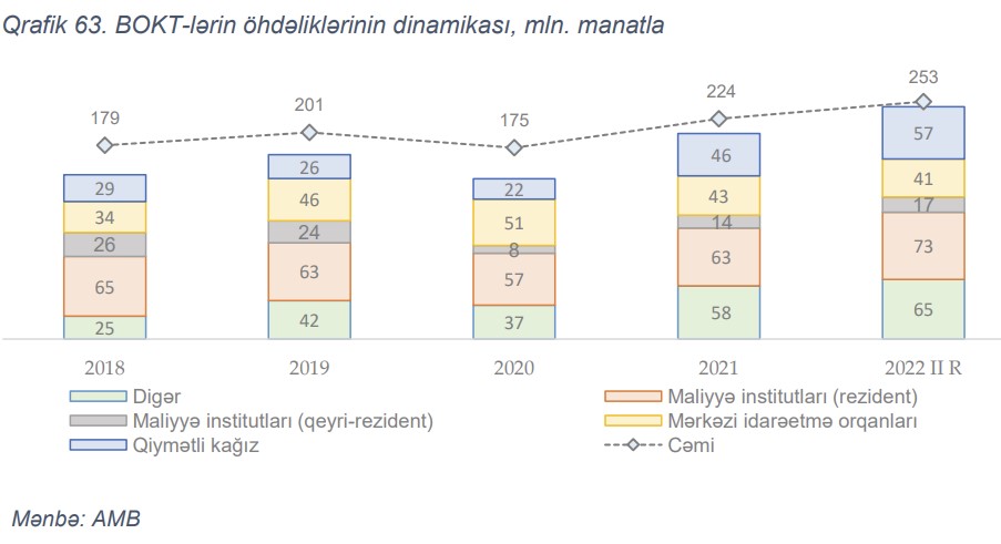 Sektorun öhdəlikləri artmışdır. Sektorun öhdəlikləri 6 ay ərzində ərzində 14% (32 mln. manat) artaraq 253 mln. manat təşkil etmişdir ki, artımın əsas səbəbi banklardan cəlb edilmiş öhdəliklərdir. Belə ki, yarımil ərzində banklardan əldə olunmuş kreditlərin həcmi 24% artaraq 66.3 mln. manat olmuşdur. Nəticədə, bank kreditlərinin öhdəliklərdə payı ötən ilin sonu ilə müqayisədə 2 f.b. artaraq 26.2%-ə çatmışdır. Kreditlər əsasən rezident banklar üzrədir. Dövr ərzində digər maliyyə institutlarına qarşı öhdəliklərin həcmi 1.8 mln. manat və ya 8% artsa da, öhdəliklərdə payı 0.5 f.b. azalaraq 9.4% təşkil edib. Habelə, BOKT-lərin emissiya etdikləri qiymətli kağız portfelində 11 mln manat artım müşahidə olunsa da, buraxılmış qiymətli kağızların cəmi öhdəliklərdə payı 2 f.b. azalaraq 22.4% təşkil edir. Qiymətli kağızlarda artım məhdud sayda BOKT-də cəmləşmişdir. Son 6 ay ərzində sektorun xarici borcu 23% (3 mln. manat) artaraq 17 mln. manat olmuşdur.