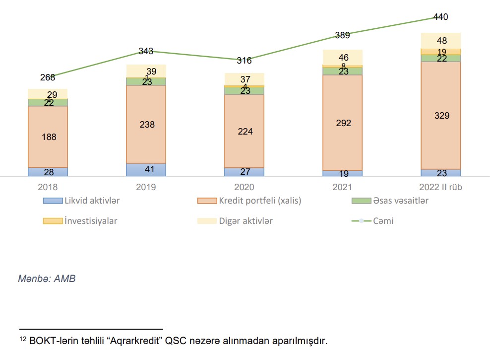 Ölkədə fəaliyyət göstərən BOKT-lərin cəmi aktivləri son 6 ay ərzində 13.3% (52 mln. manat) artaraq 440 mln. manat təşkil etmişdir. Artımın əsas drayveri xalis kredit portfeli olmuşdur. İl ərzində xalis kredit portfeli 12.4% (36 mln. manat) artmışdır ki, bu da əsasən istehlak kreditləri hesabına formalaşmışdır. Dövr ərzində BOKT-lərin investisiya portfelinin (digər törəmə təsərrüfat cəmiyyətlərində iştirak payı) 2 dəfədən çox artaraq 19 milyon manata çatdığı müşahidə edilir.