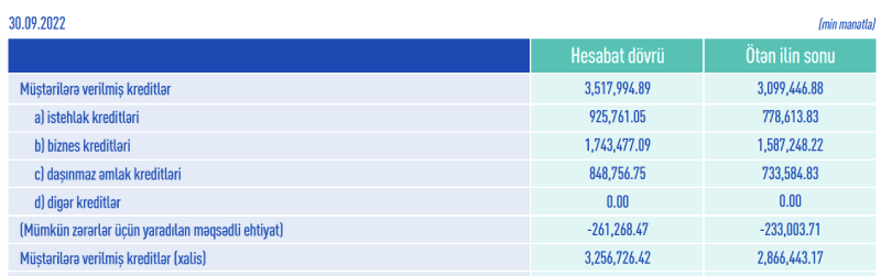 “ABB” ASC-nin kredit portfeli (müştərilərə verilmiş kreditlər) son bir il ərzində 744 milyon manat və ya 27%, 2022-ci ilin 9 ayında isə 418 milyon 548 min manat və ya 13%) artaraq 30 Sentyabr 2022-ci il tarixində 3 milyard 517 milyon 995 min manata çatıb.