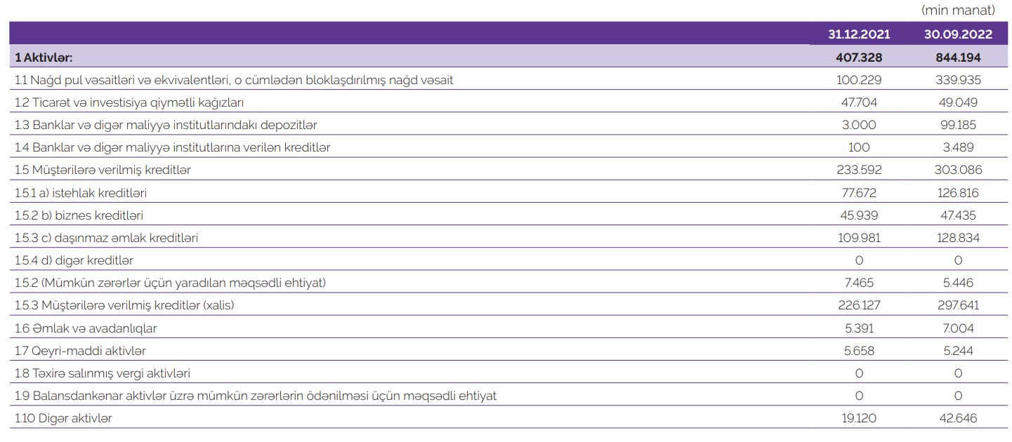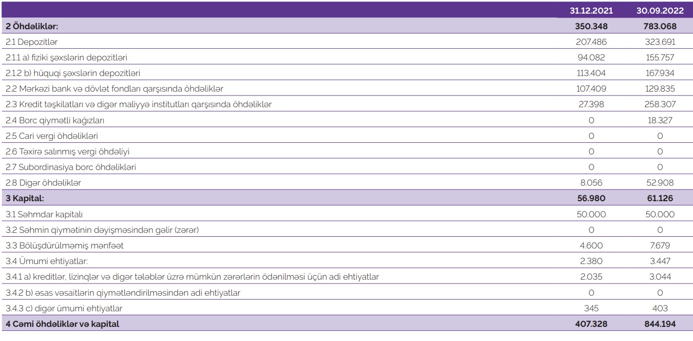 Qeyd olunan tarixdə Bankın kredit portfelinin həcmi 297,6 milyon manat, depozit portfeli 266 milyon manat olub.