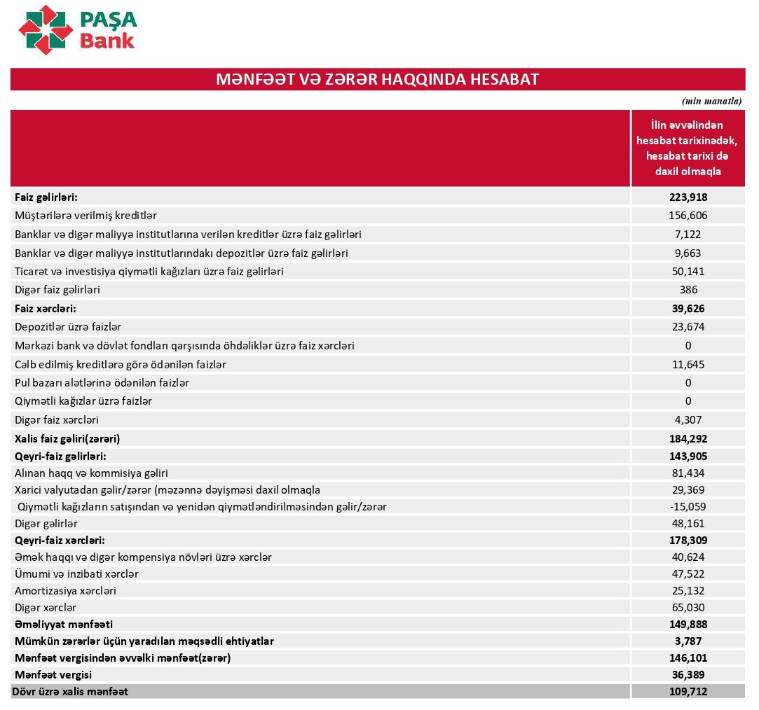 Müqayisə üçün qeyd edək ki, 2021-ci ilin 9 ayında "PAŞA Bank"ın cəmi əməliyyat gəlirləri 286 milyon 104 min manat, cəmi əməliyyat xərcləri 166 milyon 414 min manat, əməliyyat mənfəəti 119 milyon 689 min manat təşkil etmişdi.