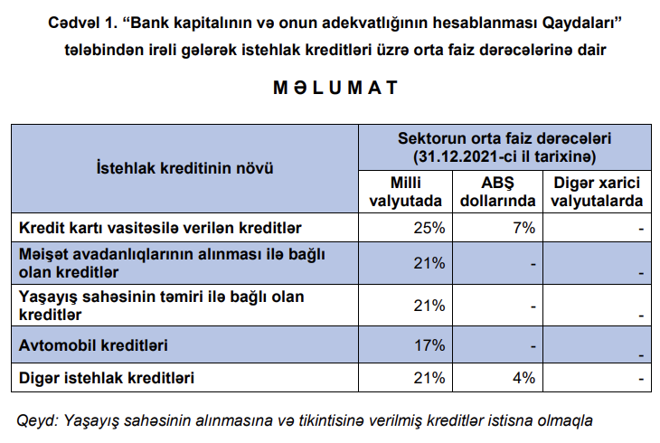 31.12.2021-ci il tarixinə, milli valyutada, orta faiz dərəcəsi "Kredit kartı vasitəsilə verilən kreditlər" üzrə 25%, "Məişət avadanlıqlarının alınması ilə bağlı olan kreditlər" üzrə 21%, "Yaşayış sahəsinin təmiri ilə bağlı olan kreditlər" üzrə 21%, "Avtomobil kreditləri" üzrə 17%, "Digər istehlak kreditləri" üzrə 21% təşkil etmişdi.