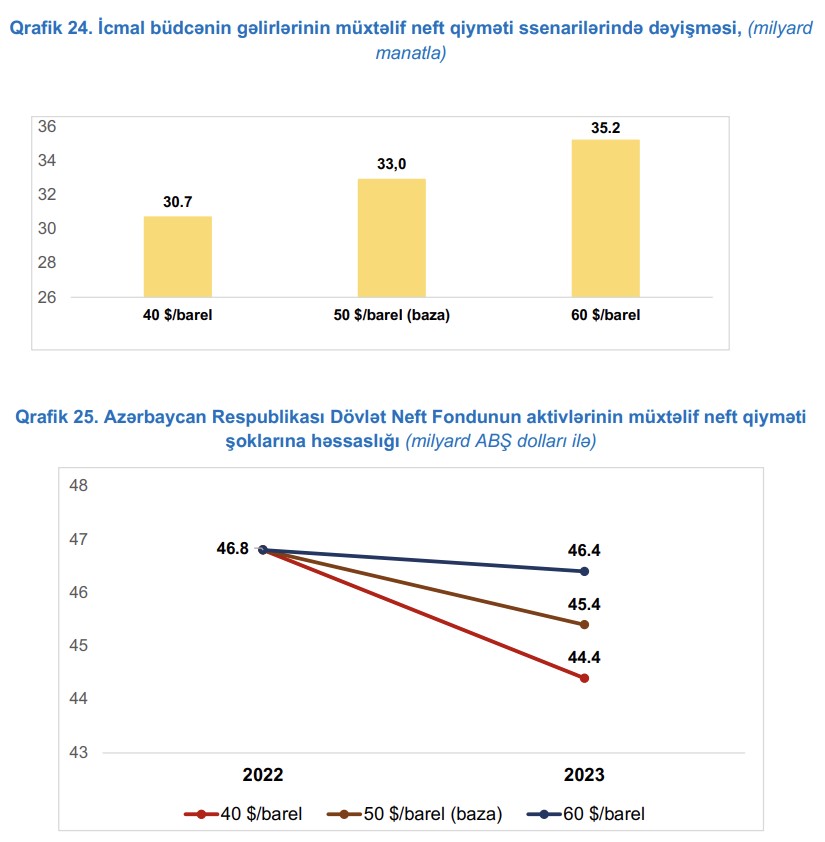 Hesablamalara əsasən neftin qiymətinin hər 10 ABŞ dolları qədər aşağı düşməsi icmal büdcə gəlirlərinin illik orta hesabla təqribən 2,2 milyard manat azalmasına gətirib çıxarır. Bu baxımdan, neft qiymətlərinin aşağı səviyyədə olması riskinin mitiqasiyası məqsədilə büdcənin gəlir və xərcləri hesablanarkən neft qiymətlərində mühafizəkar yanaşma zəruri hesab edilir.