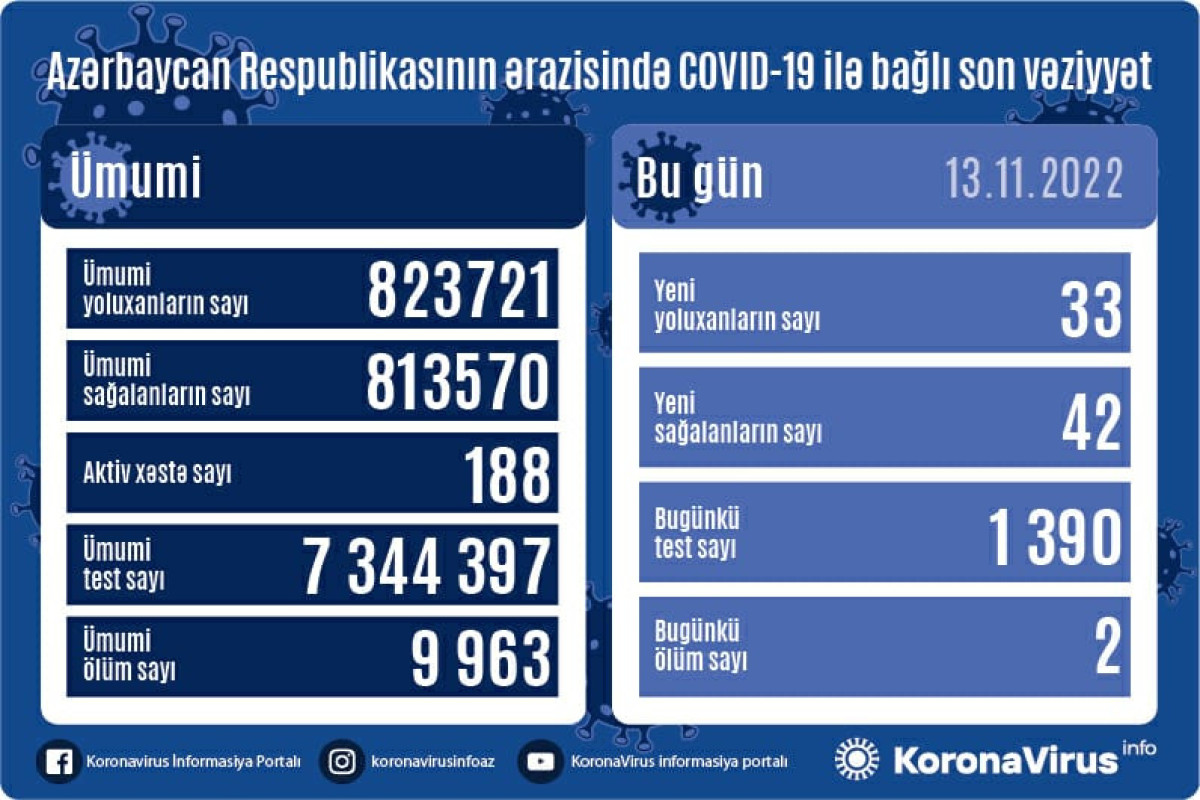 Azərbaycanda koronavirus (COVID-19) infeksiyasına 33 yeni yoluxma faktı qeydə alınıb, 42 nəfər müalicə olunaraq sağalıb.
