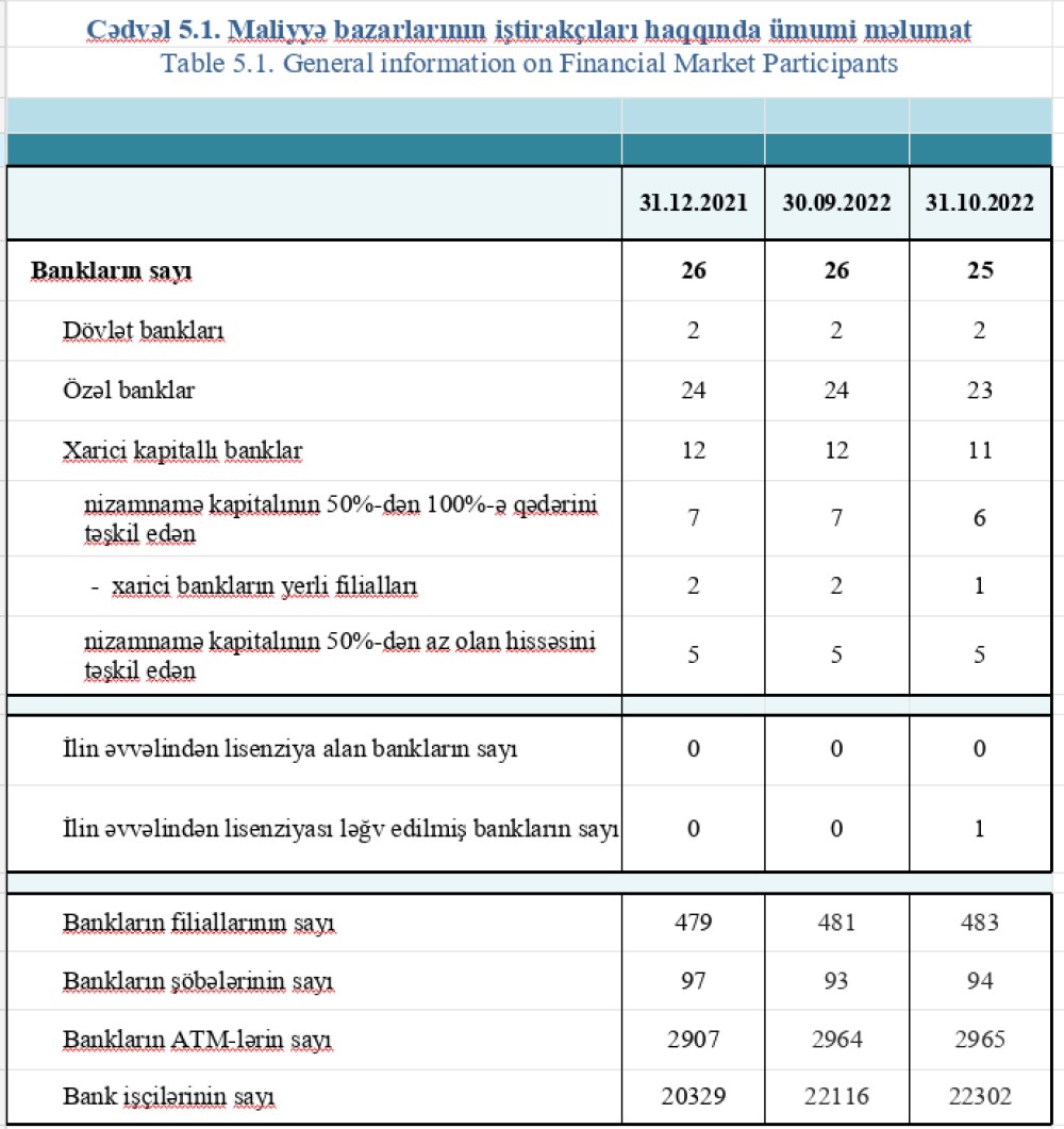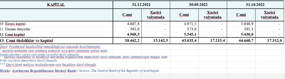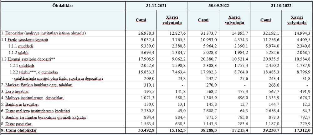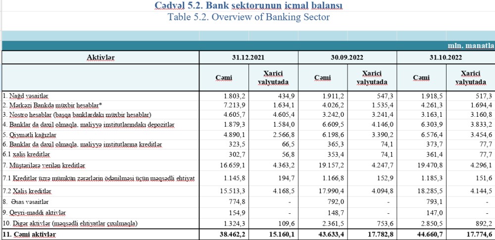 31 oktyabr 2022-ci il tarixinə fəaliyyətdə olan bankların cəmi aktivləri 44 milyard 660.7 milyon manat, cəmi öhdəlikləri 39 milyard 230.7 milyon manat, balans kapitalı 5 milyard 430 milyon manat təşkil edib. 2022-ci ilin oktyabr ayında bankların cəmi aktivləri və balans kapitalı 2.4%, cəmi öhdəlikləri müvafiq olaraq 2.5% artıb.