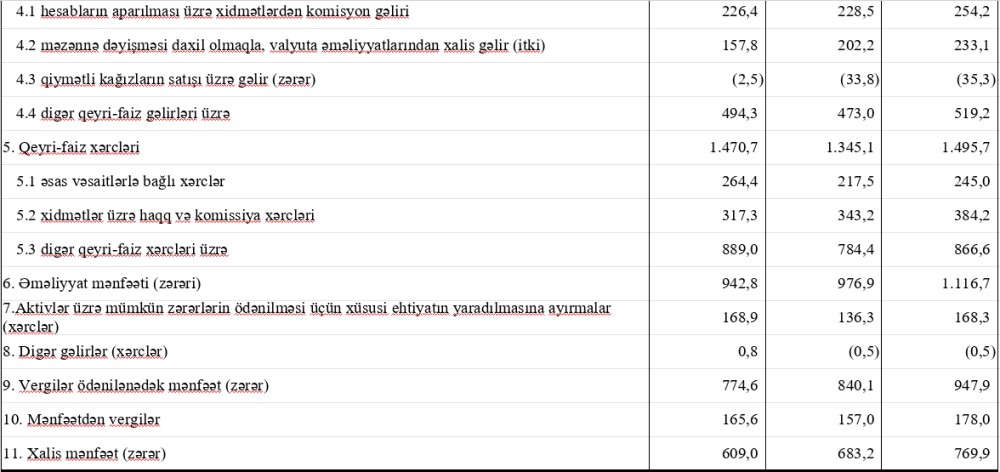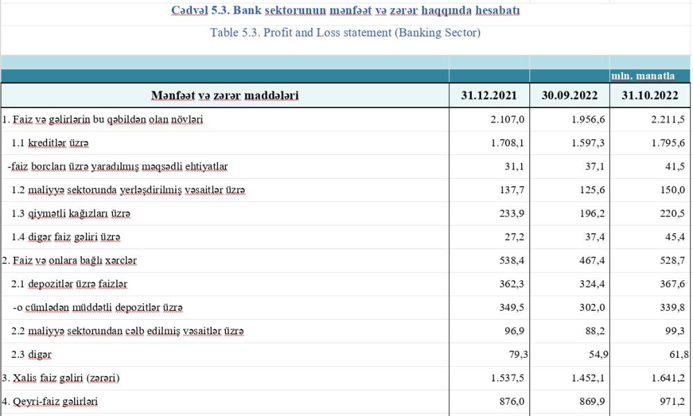 2022-ci ilin 10 ayında banklar 1 milyard 116.7 milyon manat məbləğində əməliyyat mənfəəti, 769.9 milyon manat xalis mənfəət əldə ediblər.
