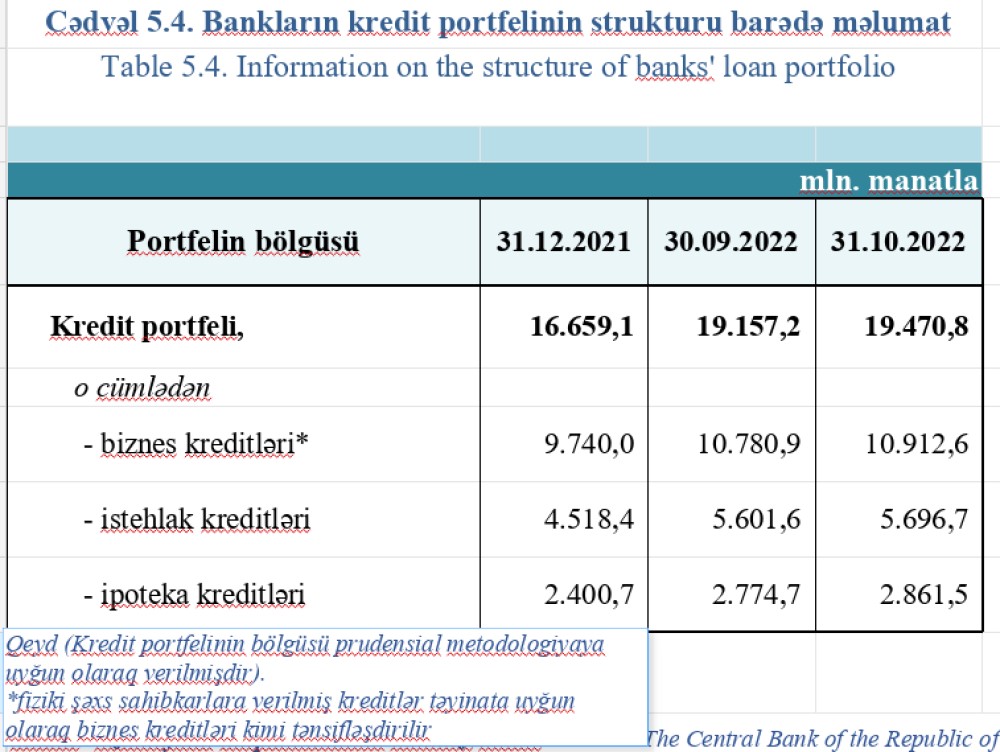 Bankların kredit portfeli oktyabr ayında 1.6% və ya 313.6 milyon manat artaraq 19 milyard 470.8 milyon manat olub.