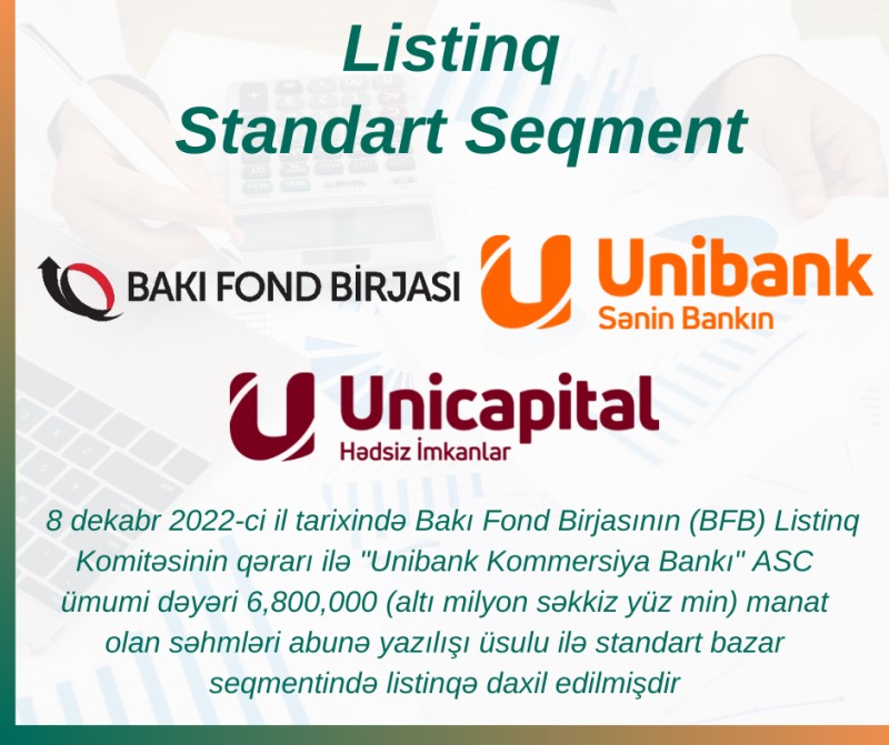 8 dekabr 2022-ci il tarixində Bakı Fond Birjasının (BFB) Listinq Komitəsinin qərarı ilə "Unibank Kommersiya Bankı" ASC ümumi dəyəri 6,8 milyon manat olan səhmləri standart bazar seqmentində listinqə daxil edilib.