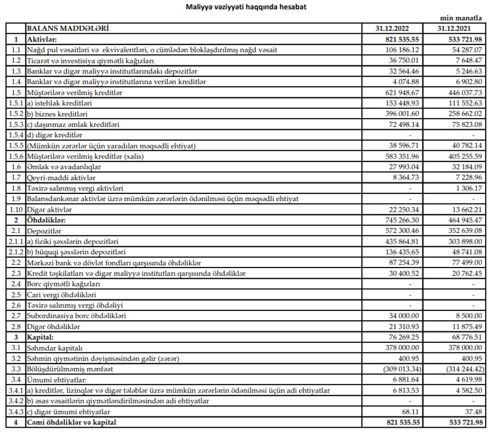 Press-relizdə qeyd edilib ki, hesabat dövrü üzrə Bankın faiz gəlirləri 86 mln manat olub. Bu isə 2021-ci il ilə müqayisədə 23 mln manat daha çoxdur. Qeyd edək ki, Bank ili