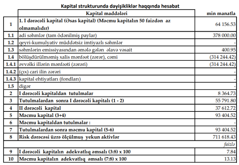 Hesabat dövrünə Bank-ın məcmu kapitalı 93 mln manatı ötüb. Bu da requlyativ tələbdən 43 mln manat çoxdur. Məcmu kapitalın adekvatlıq əmsalı 13.13%, birinci dərəcəli kapitalın adekvatlıq əmsalı isə 7.84% olmaqla, hər iki göstərici üzrə tələb olunan normanı üstələyir.