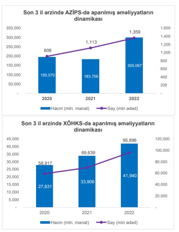 2021-ci il ilə müqayisədə aparılan əməliyyatların həcmində AZİPS üzrə 63.3%, XÖHKS üzrə isə 23.7%, AÖS üzrə isə 2 dəfə artım müşahidə olunmuşdur.