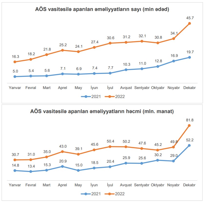 AÖS vasitəsilə 2022-ci il ərzində həyata keçirilən ödənişlərin sayı 2021-ci il ilə müqayisədə 2.9 dəfə, həcmi isə 2 dəfə artmışdır.