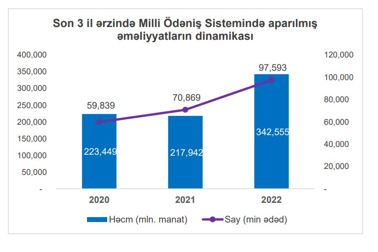 2022-ci il ərzində ölkədə Milli Ödəniş Sistemi (AZİPS, XÖHKS, AÖS) vasitəsilə aparılan əməliyyatların ümumi həcmi 343 milyard manat, sayı isə 97.6 milyon ədəd təşkil etmişdir.