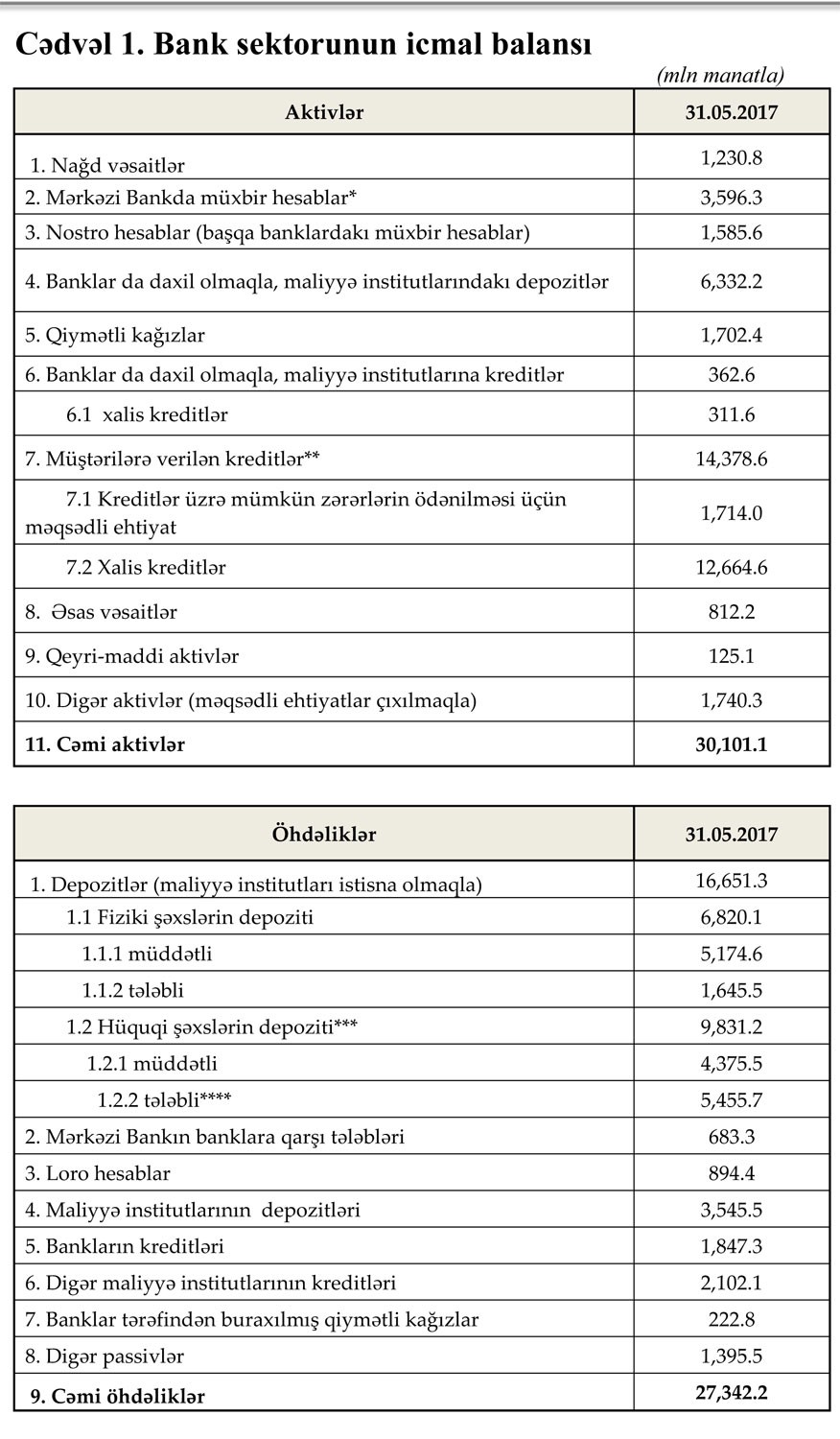 Azərbaycanda fəaliyyət göstərən 31 bankın 31 may 2017-ci il tarixinə cəmi aktivləri 30 milyard 101.1 milyon, cəmi öhdəlikləri 27 milyon 342.2 milyon manat təşkil etmişdir.