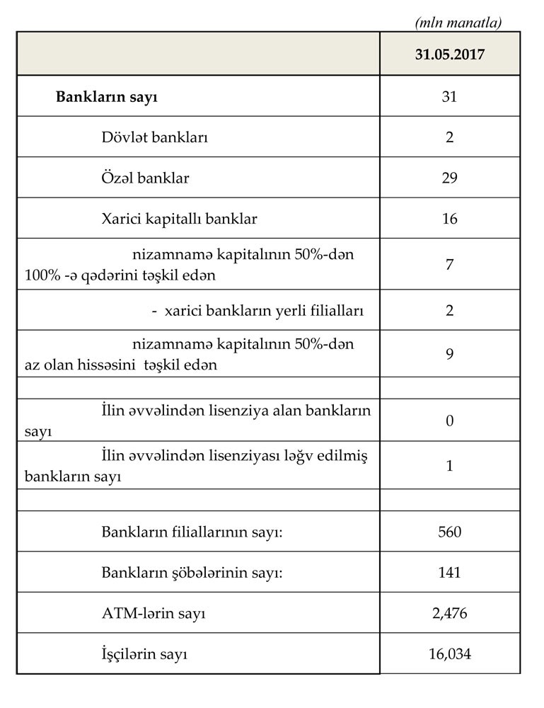 2017-ci ilin 31 may tarixinə olan bank sektorunun əsas göstəriciləri bank sektorunun icmal göstəricilərində öz əksini tapmışdır.