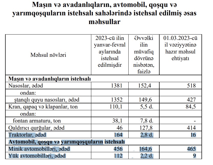 Eyni zamanda, 2023-cü ilin yanvar-fevral aylarında Azərbaycanda 164 ədəd traktor, 112 ədəd yük avtomobili istehsal olunub. İstehsal müvafiq olaraq 2,8 dəfə və 2,2 dəfə artıb. 01.03.2023-cü il vəziyyətinə traktor üzrə hazır məhsul ehtiyatı 16 ədəd, yük avtomobilləri üzrə 9 ədəd olub.