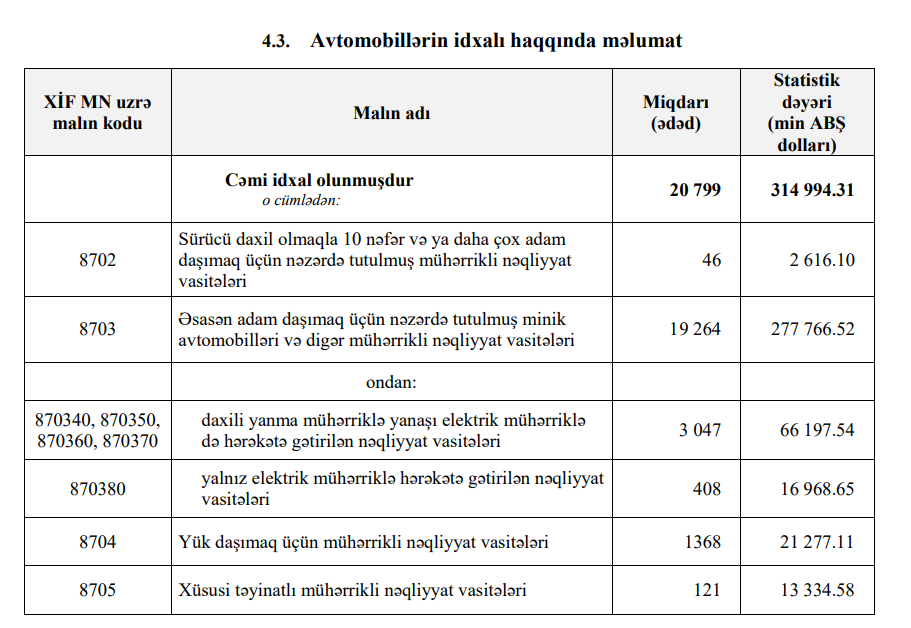 2023-cü ilin ilk rübündə (yanvar-mart) Azərbaycana 314 milyon 994 min dollar dəyərində 20 min 799 ədəd nəqliyyat vasitəsi (avtomobil) idxal edilib.