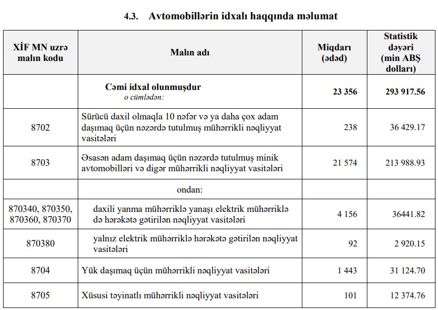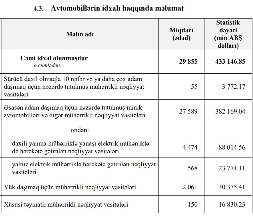 2023-cü ilin yanvar-aprel dövründə (ilk 4 ayda) Azərbaycan 433 milyon 147 min dollar dəyərində 29 min 855 ədəd nəqliyyat vasitələri (avtomobillər) idxal olunub.