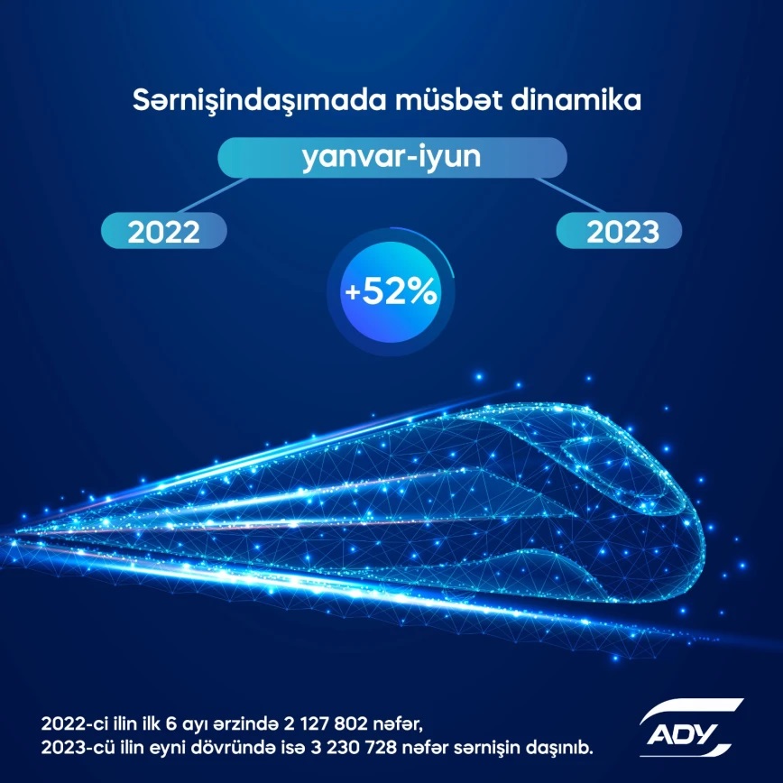 2023-cü ilin ilk 6 ayı ərzində Azərbaycan dəmir yolları ilə 3 230 728 nəfər sərnişin daşınıb. Bu, 2022-ci ilin müvafiq dövrü ilə müqayisədə 52% artım deməkdir.