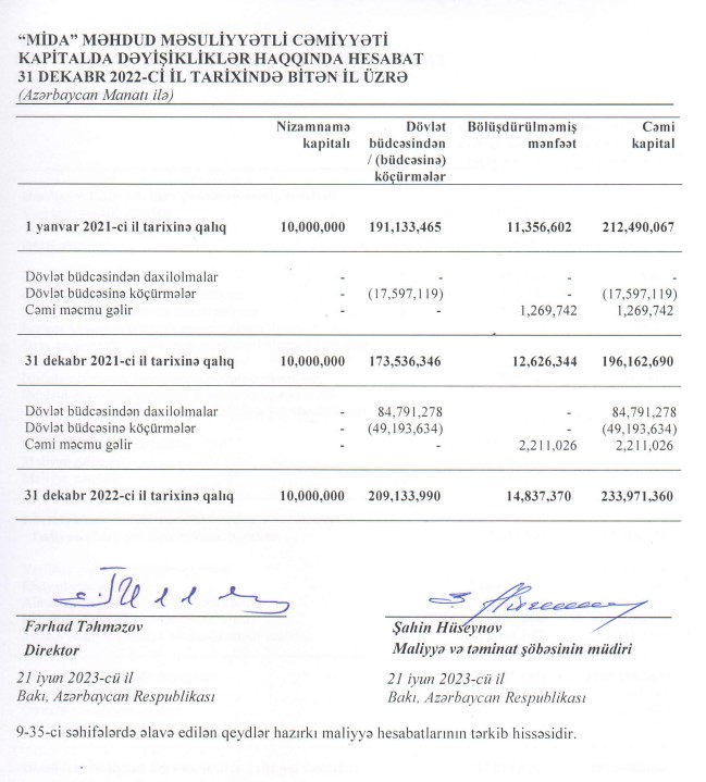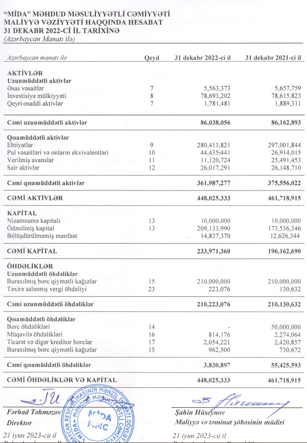 31 dekabr 2022-ci il tarixində "MİDA" MMC 448 milyon 25 min manat cəmi aktivlərə malik olub. Şirkət 2021-ci ilin sonunda 461 milyon 719 min manat cəmi aktivlərə malik idi.