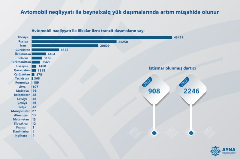 Avtomobil nəqliyyatı ilə tranzit daşımaların sayında qeydə alınan artım dinamikası isə 2022-ci ilin müvafiq dövrü ilə müqayisədə 52498 ədəd və ya 85.81% artaraq 113.675 ədədə çatıb.