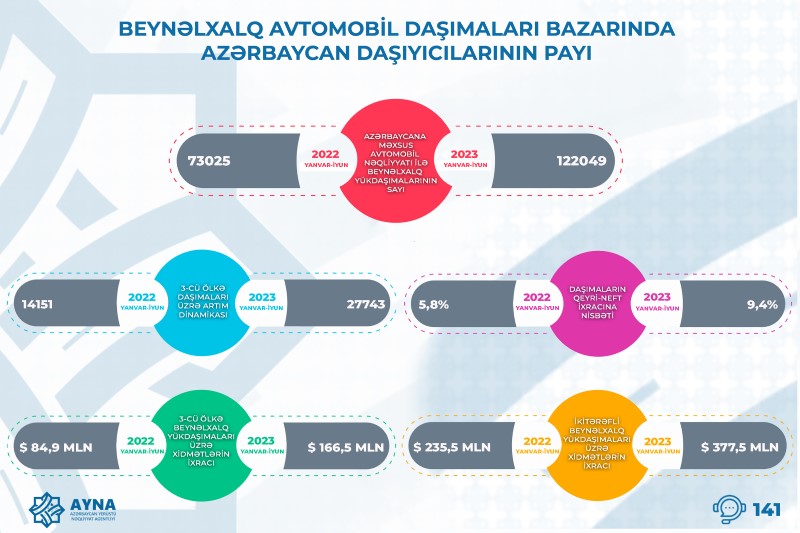 Qeyd edilib ki, Rəqəmsal İnkişaf və Nəqliyyat Nazirliyinin tabeliyində olan Azərbaycan Yerüstü Nəqliyyat Agentliyinin (AYNA) apardığı təhlillər onu göstərir ki, 2023-cü ilin ilk yarısında ölkədə Azərbaycana məxsus avtomobil nəqliyyatı ilə beynəlxalq yük daşımalarının sayı 122 min 49 olub. Bu, 2022-ci ilin eyni dövrü ilə müqayisədə 67% çoxdur.