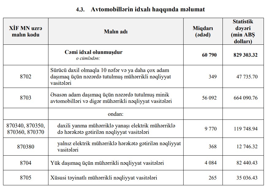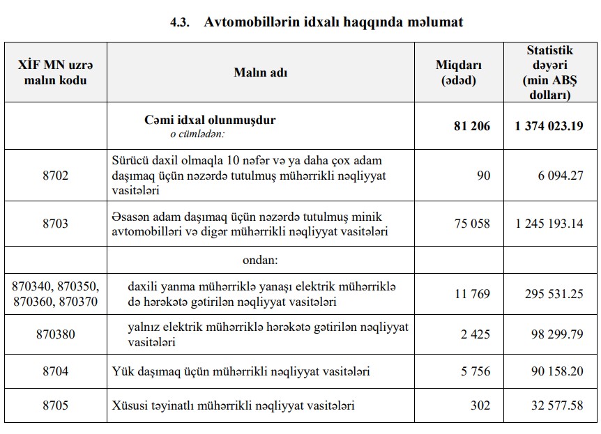 2022-ci ilin 10 ayında Azərbaycana 12 milyon 746 min dollar dəyərində 368 ədəd elektrik mühərriklə hərəkətə gətirilən nəqliyyat vasitələri idxal olunmuşdu.