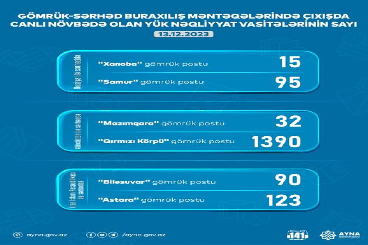 Gömrük-sərhəd məntəqələrində çıxışda gözləmədə olan nəqliyyat vasitələrinin sayı barədə məlumata əsasən, “Astara” gömrük postunda 123, “Biləsuvar” gömrük postunda 90, “Qırmızı Körpü” gömrük postunda 1390, “Mazımqara” gömrük postunda 32, “Samur” gömrük postunda 95 və “Xanoba” gömrük postunda 15 yük maşını var.