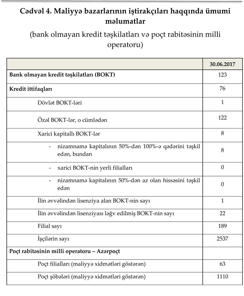 30 İyun 2017-ci il tarixinə Azərbaycanda 123 bank olmayan kredit təşkilat (BOKT) fəaliyyət göstərib.