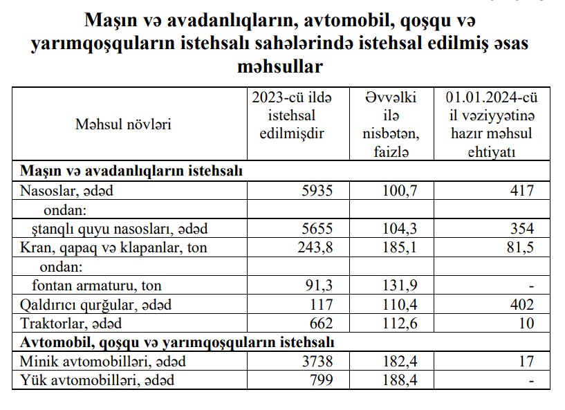 2023-cü ildə Azərbaycanda 3738 ədəd minik avtomobili, 662 ədəd traktor və 799 ədəd yük avtomobili yığılıb.