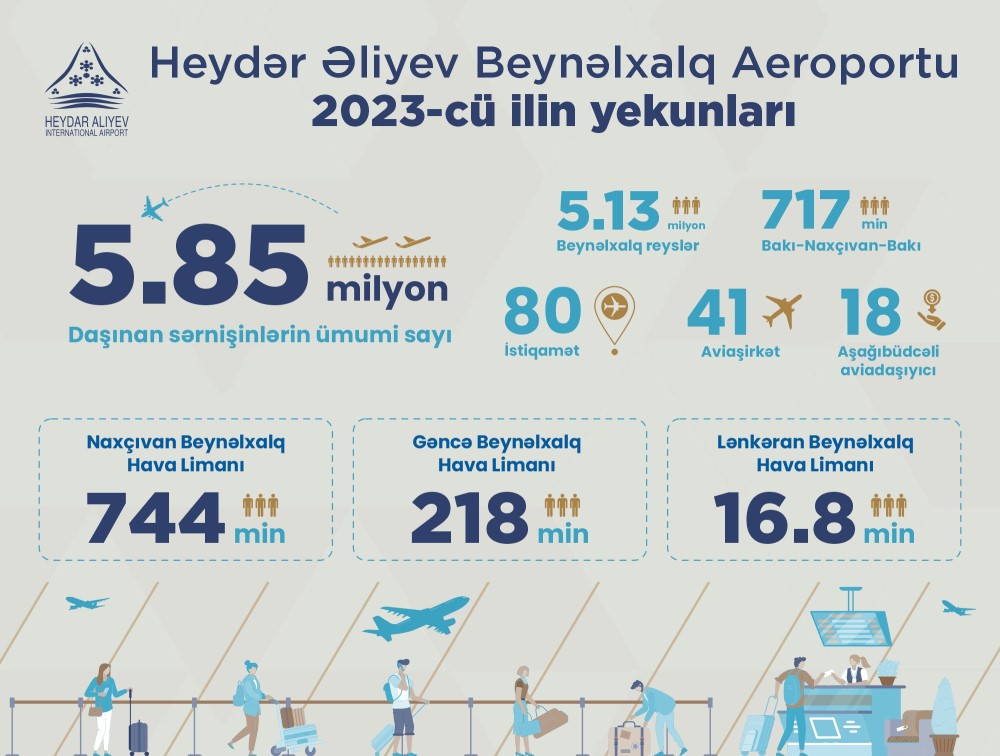 Ölkənin əsas hava qovşağı olan Heydər Əliyev Beynəlxalq Aeroportunda sərnişin dövriyyəsi 2023-cü ildə rekord həddə yüksəlib - 5,85 milyondan çox sərnişinə xidmət göstərilib.
