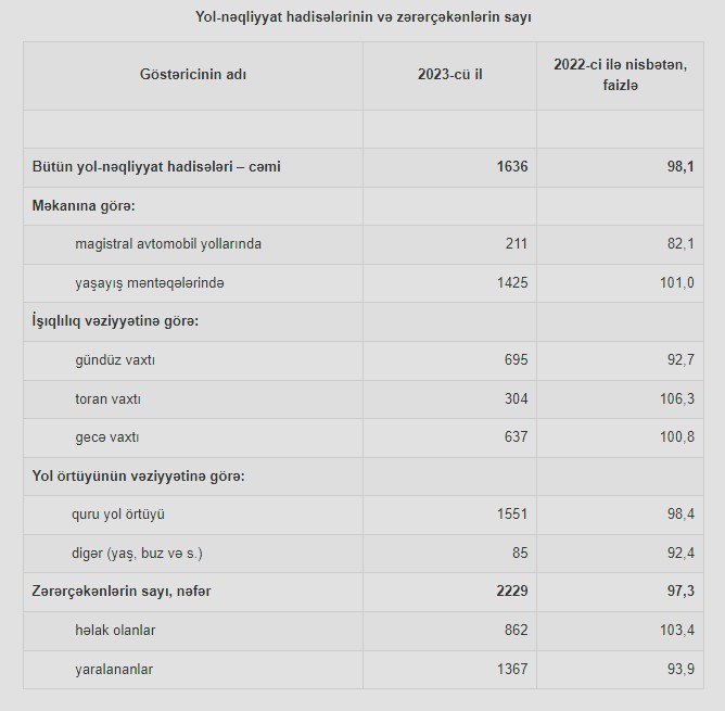 Dövlət Statistika Komitəsinin yaydığı məlumata görə, 2023-cü ildə 1636 və ya 2022-ci illə müqayisədə 1,9 faiz az yol-nəqliyyat hadisəsi baş vermiş, bu hadisələr nəticəsində zərər çəkən şəxslərin sayı 2,7 faiz azalaraq 2229 nəfər olmuşdur. Onlardan 862-si həlak olmuş, 1367-si isə yaralanmışdır.