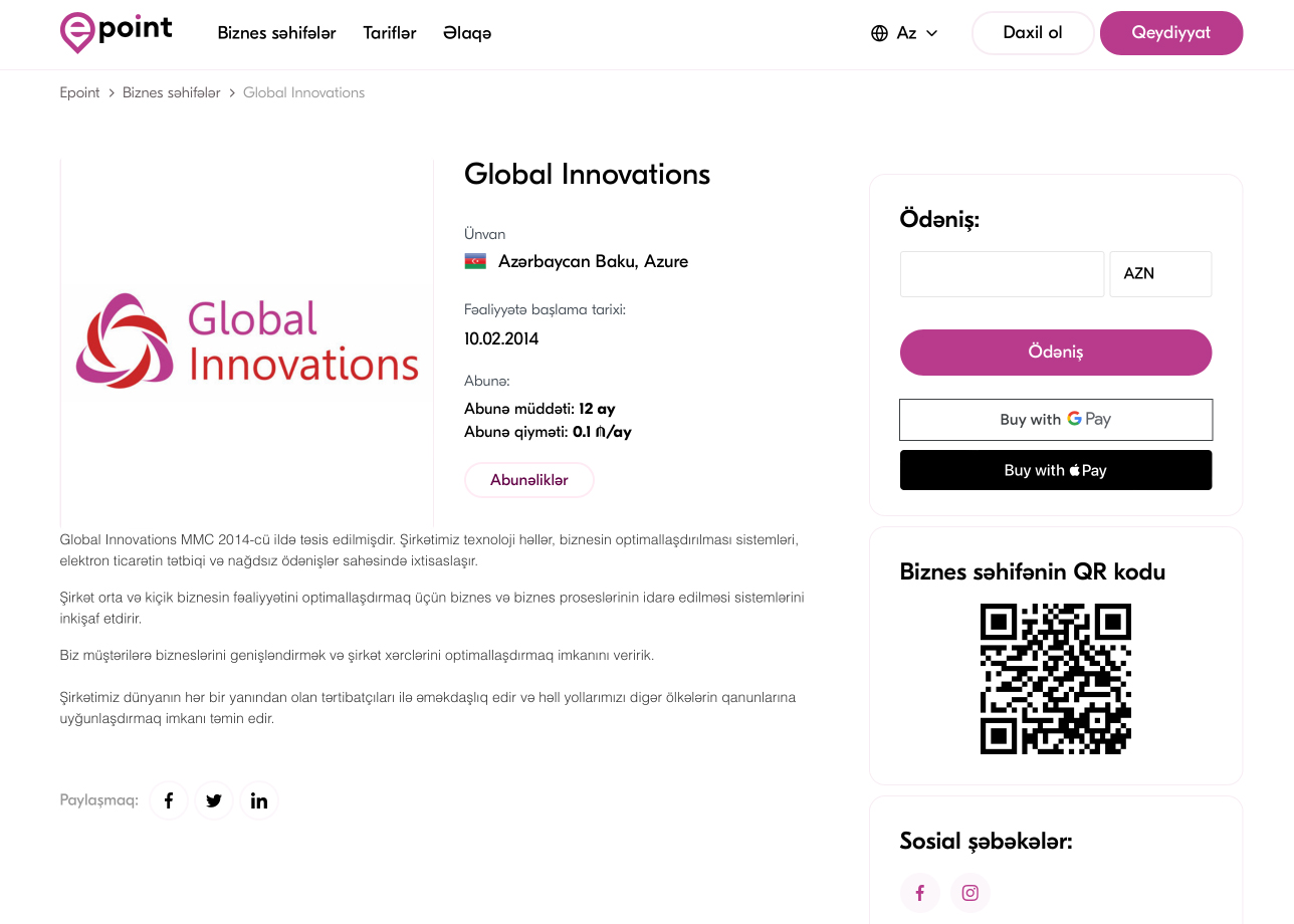 2. Müştərinin veb-saytı və ya proqramı yoxdursa, Epoint-ə qoşularaq ödəniş alətlərinə inteqrasiya olunmuş pulsuz mini-sayt (Biznes səhifəsi) əldə edə bilər. Müştəri, istənilən vaxt hansı növ ödənişləri qəbul etmək istədiyinə özü nəzarət və ödənişləri idarə edə bilər. Ödənişlərin qəbulu üçün hazır platformadan istifadə edərək, müştəri öz veb-saytını yaratmadan və xərcləri olmadan, dərhal ödənişləri qəbul etməyə və satış konversiyasını artıra bilər.