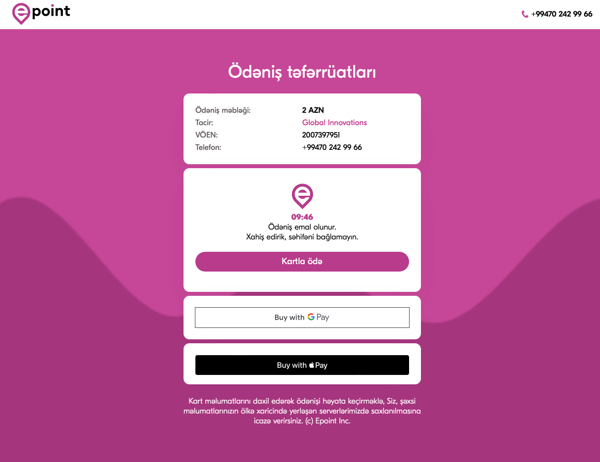 (®) Epoint.az KOS müştərilərinə Apple Pay və Google Pay tokenləşdirilmiş ödənişlərdən istifadə etməklə mal və xidmətlər üçün elektron ticarət ödənişlərini qəbul etmək imkanı verir.