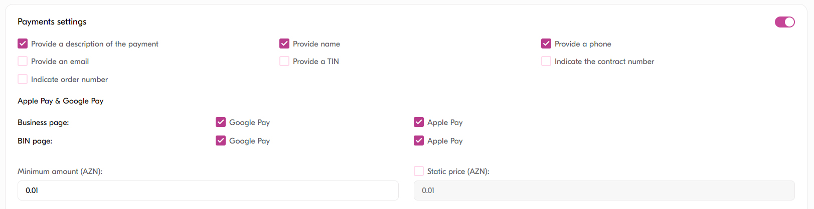 1. Müştərinin veb-saytı və ya mobil tətbiqi varsa, bir neçə dəqiqə ərzində təqdim olunan API protokolu vasitəsilə inteqrasiya edərək müştəriləri üçün Apple Pay və Google Pay ödəniş xidmətlərini qəbul edə bilər.