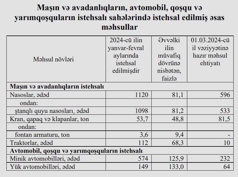 2024-сü ilin yanvar-fevral aylarında Azərbaycanda 574 ədəd və ya əvvəlki ilin müvafiq dövrü ilə müqayisədə 118 ədəd və ya 25,9% çox minik avtomobili istehsal olunub. 01.03.2024-cü il vəziyyətinə hazır məhsul ehtiyatı 232 ədəd olub.