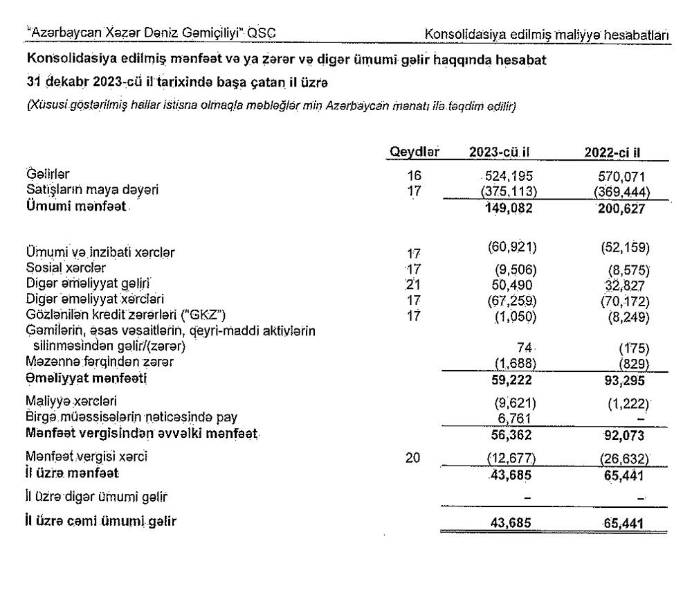 “Azərbaycan Xəzər Dəniz Gəmiçiliyi” QSC 2023-cü ili 43 milyon 685 min manat xalis mənfəət ilə başa vurub. Dövlət şirkəti 2022-ci ili 65 milyon 441 min manat xalis mənfəət ilə bağlamışdı. Beləliklə, “Azərbaycan Xəzər Dəniz Gəmiçiliyi” QSC-nin xalis mənfəəti 2023-cü ildə 2022-ci illə müqayisədə 21 milyon 756 min manat və ya 33,2% azalıb.