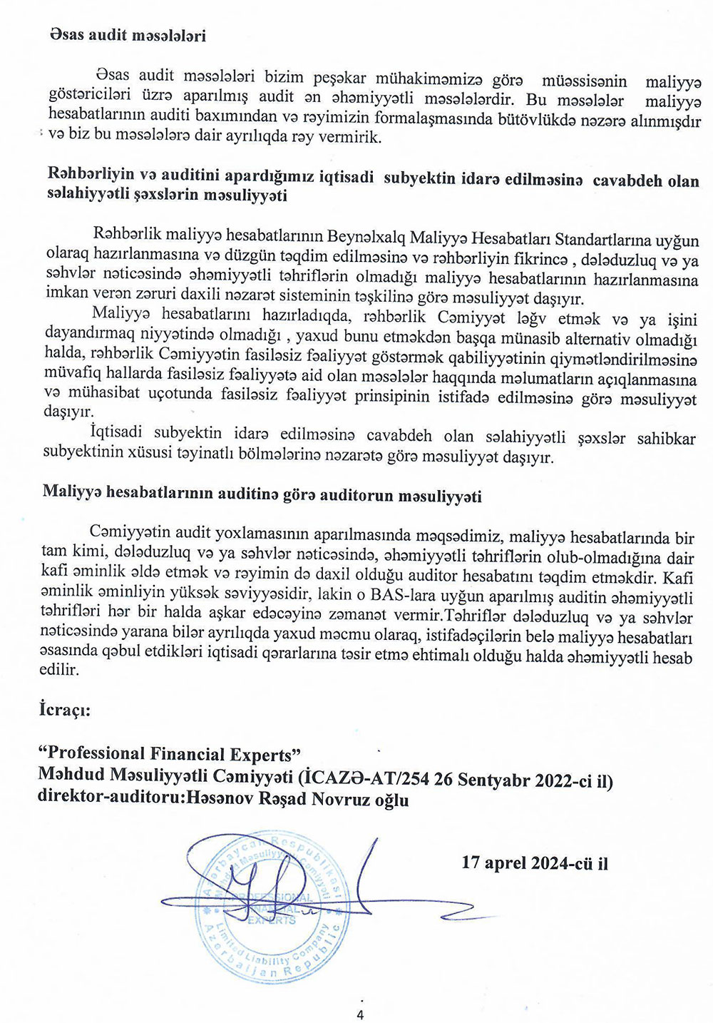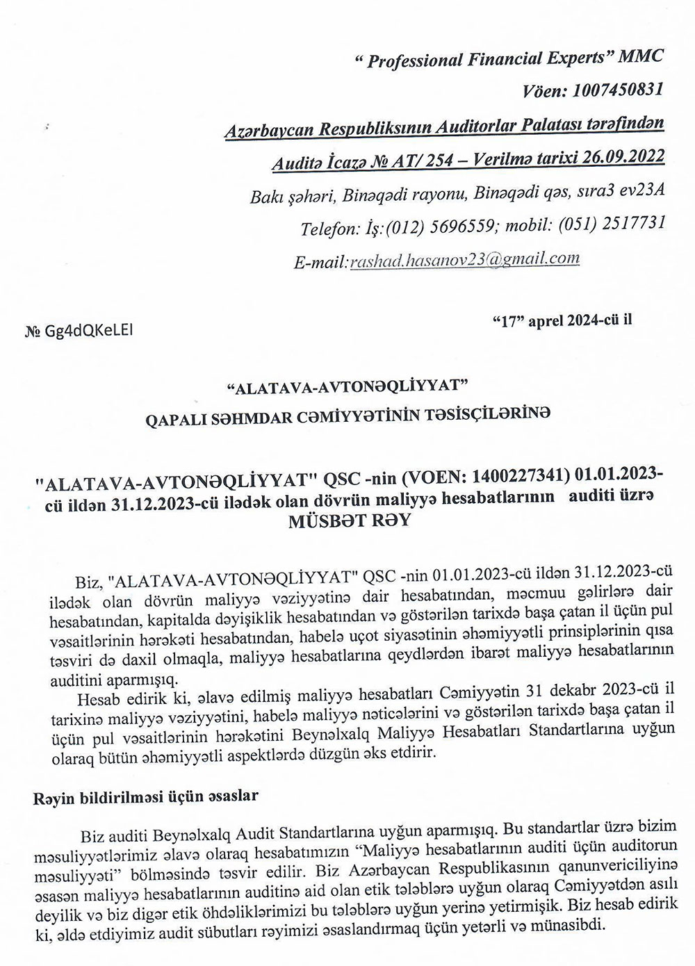 "Alatava-Avtonəqliyyat" QSC-nin 31 dekabr 2023-cü il tarixində başa çatan il üzrə maliyyə hesabatları.