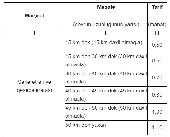 Ölkədaxili müntəzəm şəhərətrafı və qəsəbələrarası avtobus marşrutlarında sərnişindaşıma xidmətlərinin tariflərinin yuxarı hədləri: