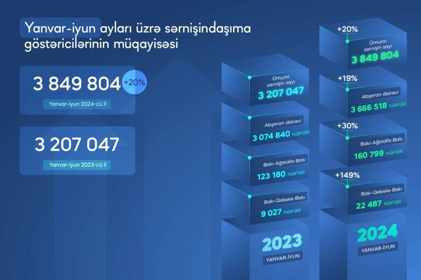 "Azərbaycan Dəmir Yolları” QSC (ADY) 2024-cü ilin yanvar-iyun aylarında 3 849 804 sərnişin daşıyıb. Bu, ötən ilin eyni dövrü ilə müqayisədə 20 faiz çoxdur.