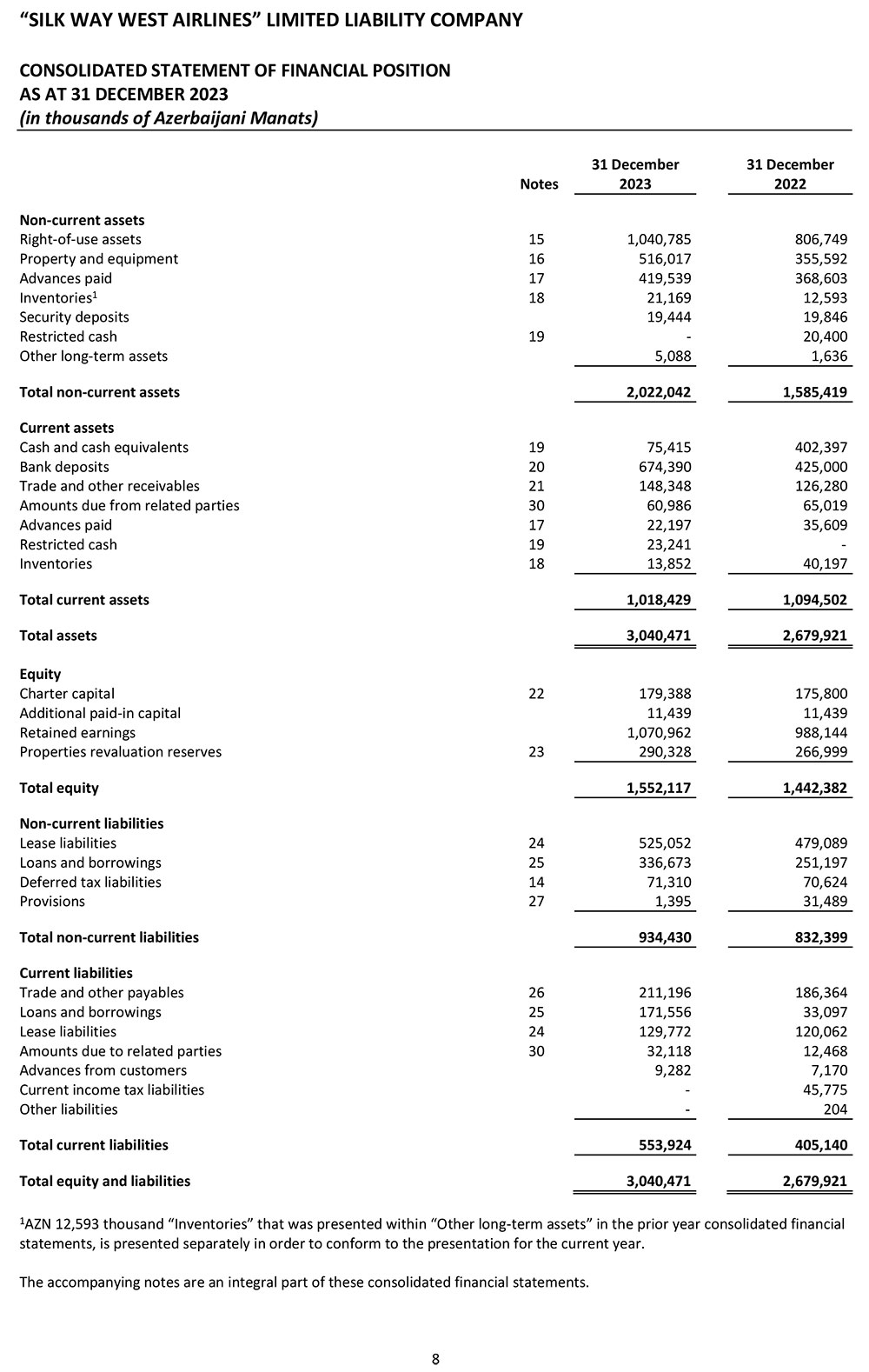 31 dekabr 2023-cü il tarixində "Silk Vey Vest Aviaşirkəti" 3 milyard 40 milyon manat cəmi aktivlərə malik olub. Şirkət 2022-ci ilin sonunda 2 milyard 680 milyon manat cəmi aktivlərə malik idi.