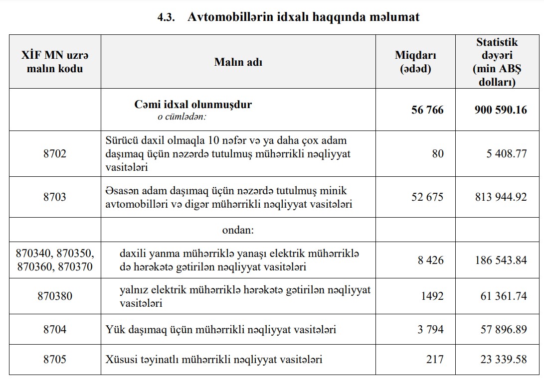 Qeyd edək ki, 2023-cü ilin 7 ayı ərzində (yanvar-iyul) Azərbaycana 900 milyon 590 min dollar dəyərində 56 min 766 ədəd avtomobil idxal edilmişdi.