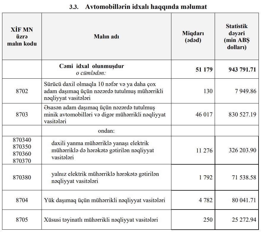 2024-cü ilin 7 ayı ərzində (yanvar-iyul) Azərbaycana 943 milyon 792 min dollar dəyərində 51 min 179 ədəd nəqliyyat vasitəsi (avtomobil) idxal olunub.