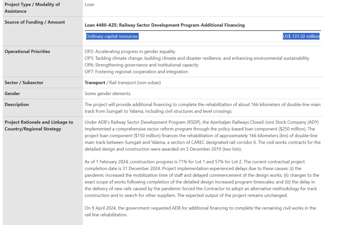 “Dəmir yolu infrastrukturunun modernləşdirilməsi təhlükəsizliyi və enerji səmərəliliyini artıracaq və nəqliyyat xərclərini azaldacaq. Bundan əlavə, bu, Azərbaycanın Avropa və Asiyanın kəsişməsindəki strateji mövqeyini gücləndirəcək”, - ADB-nin Mərkəzi və Qərbi Asiya Regional Departamentinin Baş direktoru Yevgeni Jukov bildirib.