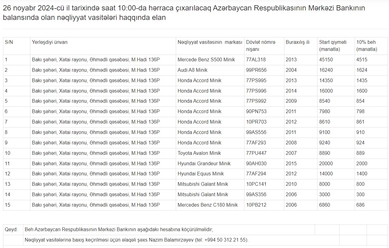 İqtisadiyyat Nazirliyi yanında Əmlak Məsələləri Dövlət Xidməti Azərbaycan Mərkəzi Bankının balansındakı 15 nəqliyyat vasitəsini açıq hərraca çıxarmağa hazırlaşır.