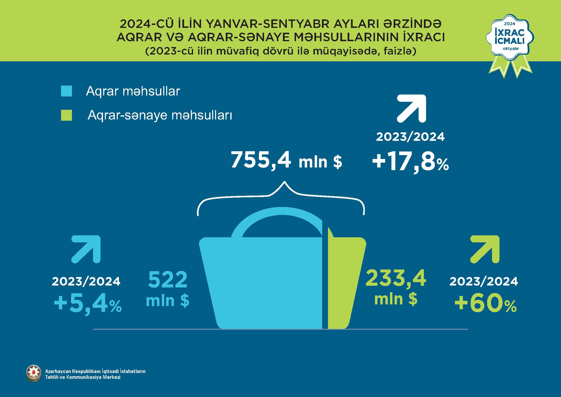2024-cü ilin yanvar-sentyabr ayları ərzində aqrar-sənaye məhsullarının ixracı 60% artaraq 233,4 milyon ABŞ dollarına bərabər olub. Bütövlükdə aqrar və aqrar-sənaye məhsullarının birgə ixracı 17,8% artaraq 755,4 milyon ABŞ dolları təşkil edib.