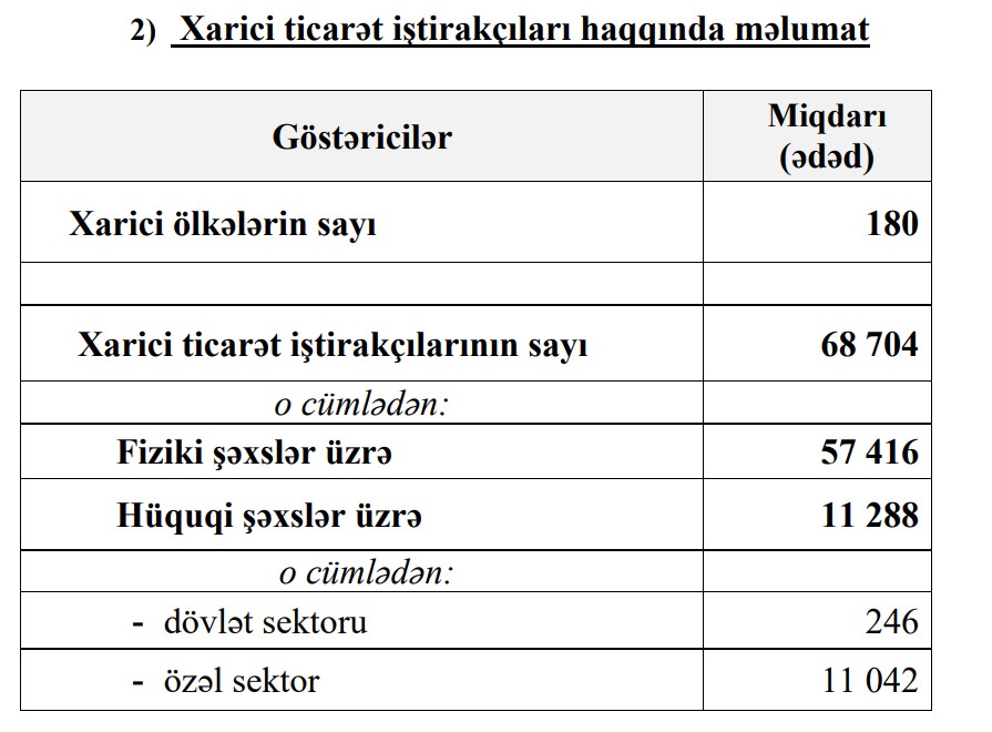 2024-cü ildə Azərbaycanda xarici ticarət iştirakçılarının sayı 68 min 704 şəxs olub. Bu say 2023-cü illə müqayisədə 3 min 63 şəxs azdır.